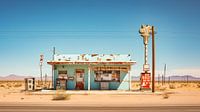 Stap terug in de tijd naar het nostalgische Amerika van de jaren vijftig met de vintage kunstprint van een oude, vervallen bar/cafe in een verlaten landschap.