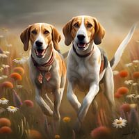 Koop dit digital art kunstwerk Amerikaanse Foxhounds spelend in een bloemenveld van Johannas Art Creations als reproductie op canvas, aluminium dibond, (ingelijste) fotoprint, behang en ArtFrame, op maat geprint in Fine-Art kwaliteit.
