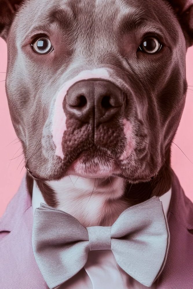 Met een charmante uitdrukking en een elegant paars pak straalt deze American Pit Bull Terrier een onmiskenbare mix van waardigheid en speelsheid uit. Het knappe gezicht en de zachte ogen springen meteen in het oog, terwijl de zwarte snuit en geprononceerde oren zijn karakter perfect benadrukken. Een echte gentleman met stijl!