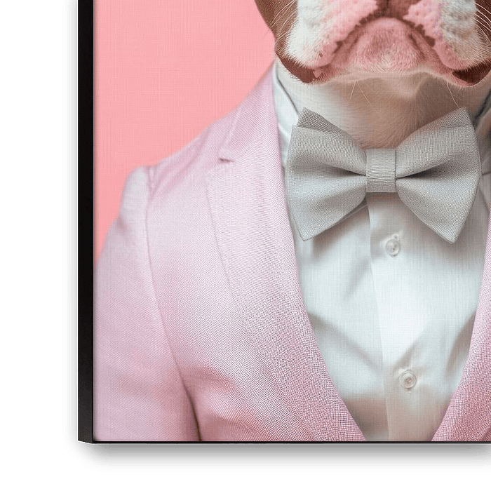 Met een charmante glimlach en een elegant roze pak straalt deze American Pit Bull Terrier zelfvertrouwen en stijl uit. Zijn zachte blik en opvallende, gespierde gelaatstrekken belichamen zowel kracht als gratie. De klassiek gestrikte strik rondt deze buitengewone outfit perfect af - een echte gentleman op vier poten!