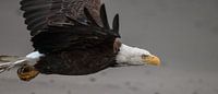 Amerikaanse Zeearend in vlucht. De Amerikaanse zeearend heeft in tegenstelling tot de Afrikaanse zeearend een snavel die helemaal geel is. De volwassen vogel is geheel donkerbruin met een witte kop en staart.