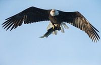 Amerikaanse Zeearend in vlucht in Alaska met een net gevangen zalm in zijn klauwen. De Amerikaanse zeearend heeft in tegenstelling tot de Afrikaanse zeearend een snavel die helemaal geel is. De volwassen vogel is geheel donkerbruin met een witte kop en staart.