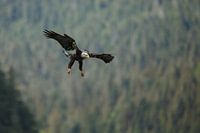 Zeearend in volle vlucht met de vleugels weid open en de klauwen klaar om een vis te pakken. De Amerikaanse zeearend heeft in tegenstelling tot de Afrikaanse zeearend een snavel die helemaal geel is. De volwassen vogel is geheel donkerbruin met een witte kop en staart.