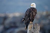 Amerikaanse Zeearend op een paal Amerikaanse Zeearend portret met een mooie witte kop en prachtige ogen. De Amerikaanse zeearend heeft in tegenstelling tot de Afrikaanse zeearend een snavel die helemaal geel is. De volwassen vogel is geheel donkerbruin met een witte kop en staart.