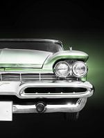 Het toont de voorkant van een grote Amerikaanse klassieke auto uit 1959, met de nadruk op enkele details van deze spectaculaire auto.