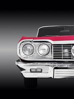 De foto toont de voorkant van een Amerikaanse klassieker uit 1964, waarbij de nadruk ligt op enkele details van deze fantastische auto. De focus ligt op het samenspel van lijnen, kleuren en vlakken.