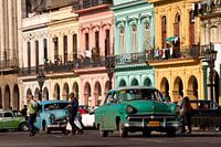 Amerikaanse klassieke auto's uit de jaren 50 en kleurrijke gevels in het centrum Centro Habana van Havana, Cuba, Caribisch gebied |