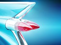 De foto toont de staartvin van een legendarische Amerikaanse klassieker uit 1959. De focus ligt op enkele details van deze spectaculaire auto.