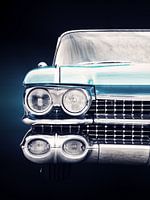 De foto toont de voorkant van een legendarische Amerikaanse klassieker uit 1959, waarbij de nadruk ligt op enkele details van deze spectaculaire auto. De nadruk ligt op het samenspel van lijnen, kleuren en oppervlakken.