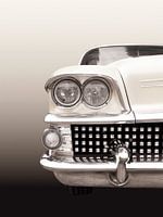 De foto toont u de voorkant van een Amerikaanse oldtimer uit 1958, met de nadruk op enkele details van een spectaculaire auto uit die tijd.