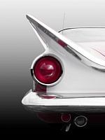 Het toont u de achterkant van een legendarische Amerikaanse oldtimer uit 1959. De nadruk ligt op enkele details van deze spectaculaire auto.