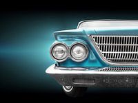 De foto nodigt u uit om in de wereld van de jaren zestig te duiken. Een tijd waarin Amerikaanse roadcruisers met gigantische chromen grilles de straten veroverden.
