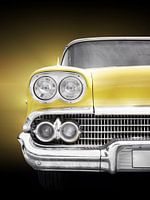 De foto toont de voorkant van een fantastische Amerikaanse klassieker uit 1958. De focus ligt op enkele details van deze spectaculaire auto. De focus ligt op het samenspel van lijnen, kleuren en oppervlakken.