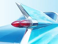 Het toont u de achterkant van een legendarische Amerikaanse oldtimer uit 1959. De nadruk ligt op enkele details van deze spectaculaire auto.