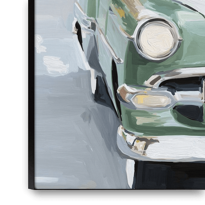 Dit kunstwerk laat een Chevrolet Bel Air zien van dichtbij, rijdend door een stedelijke omgeving. De auto is krachtig en zelfverzekerd in beeld gebracht, waarbij de focus ligt op de herkenbare voorkant: de ronde koplamp, het glanzende chroom en de robuuste grille. Door het gekozen perspectief voelt het alsof de auto zo uit het beeld…