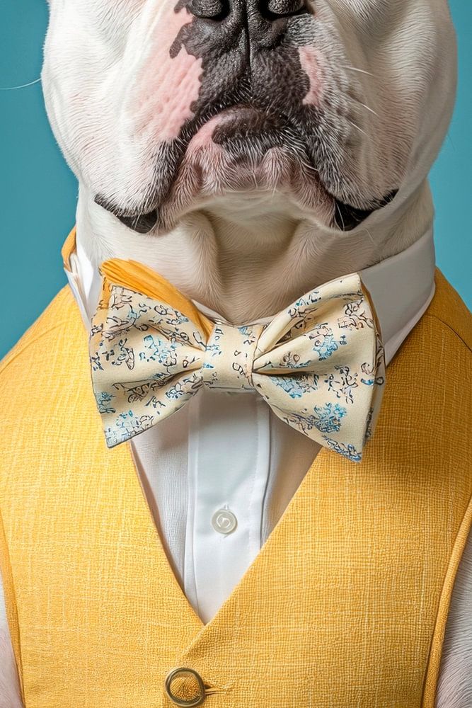 Een elegante American Bully in een felgeel pak en een discreet vlinderdasje belichaamt charme en zelfvertrouwen. Zijn gespierde bouw en zachte, liefdevolle ogen stralen zowel kracht als warmte uit. Met een uitdrukking die zowel trots als vriendelijk is, trekt hij ieders aandacht en straalt hij een vleugje ongedwongen elegantie uit.