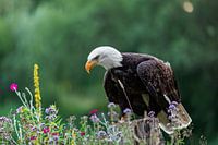 Amerikaanse zeearend( haliaeetus leucocephalus) op een paaltje tussen de bloemen