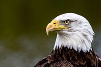 portret van een Amerikaanse zeearend met scherpe snavel en helder oog tegen een wazige donkergroene achtergrond