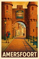 Deze kunstig geïllustreerde poster toont de beroemde Koppelpoort van Amersfoort, een van de mooiste middeleeuwse steden in Nederland. Het tafereel vangt de unieke sfeer van de oude binnenstad: kinderkopjes, historische baksteenarchitectuur en de majestueuze dubbeltorenstructuur van de poort die een gracht overspant. Een toerist met een…
