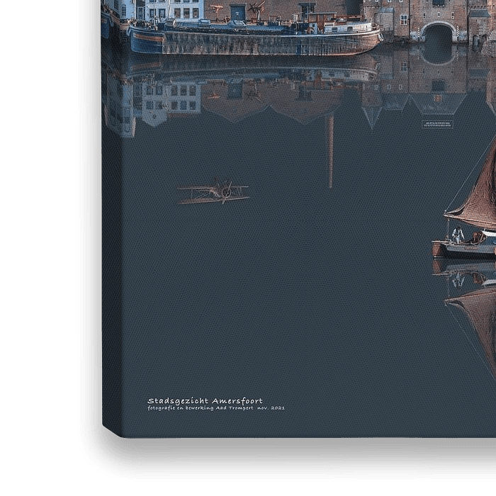 Stadsgezicht van Amersfoort, zorgvuldig samengesteld uit gefotografeerde historische gebouwen in Amersfoort zoals: de Koppelpoort, de St.-Joriskerk, de Onze Lieve Vrouwentoren, de Nieuwe Stad in het Eemkwartier en de typerende achterkanten van de huizen langs de Lange Gracht.