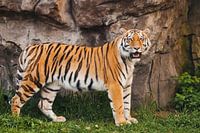 Amoertijger staat bij rotswand op groen gras