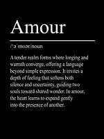 Deze definitie poster toont het woord "Amour" in een elegante, minimalistische typografie. De term staat voor liefde, warmte en een diepe emotionele verbinding die verder gaat dan eenvoudige woorden.