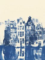 Een elegant kunstwerk in diep Delfts blauw dat de karakteristieke gevels van Amsterdamse grachtenpanden vangt in een tijdloze sfeer. De verfachtige overgangen en het monochrome kleurenpalet geven het geheel een poëtisch en nostalgisch gevoel. Deze print is een ode aan Nederlandse architectuur en ambacht, perfect voor wie houdt van…