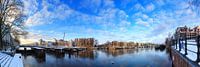 Prachtige 180 graden panoramische opname van rivier de Amstel in Amsterdam, Nederland, op een winterse dag met sneeuw en ijs en een blauwe lucht, met rechts de magere brug