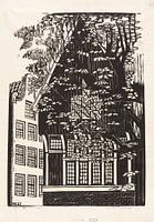 Gezicht op het Houten Huys gelegen aan de Begijnhof 34 in Amsterdam. Voor de gevel van het huis een boom. Linksachter een huis met klokgevel.