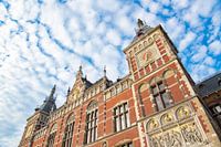 Het gebouw van Amsterdam Centraal met een blauwe lucht en pluisjes op de achtergrond.