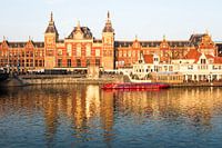 Amsterdam Centraal Station in de winter. De laagstaande zon zorgt voor prachtige oranje en rode kleuren. Het licht en het gebouw worden mooi weerspiegeld in het water.