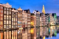 Prachtige opname van het Damrak in Amsterdam vlak voor zonsopgang met reflectie van de grachtenpanden in het water