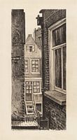 Zicht op een huis tussen twee andere huizen door in een stadsgezicht.