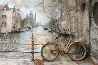 Een sfeervol schilderij van een fiets langs de grachten van Amsterdam straalt nostalgie en charme uit.