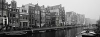 Deze panoramafoto geeft een typisch Amsterdams beeld: grachtenhuizen aan de gracht.