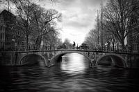 Een typisch Amsterdams tafereel: een fietser steekt een brug over een kanaal over. Rechts en links ziet u de grachtenpanden. De bruggen zijn overal langs de grachtengordel te vinden. Ze geven de stad haar bijzondere charme, omdat ze er met hun ronde bogen heel nostalgisch uitzien. Het licht-donker contrast benadrukt de contouren van de brug en de fietser in het midden.