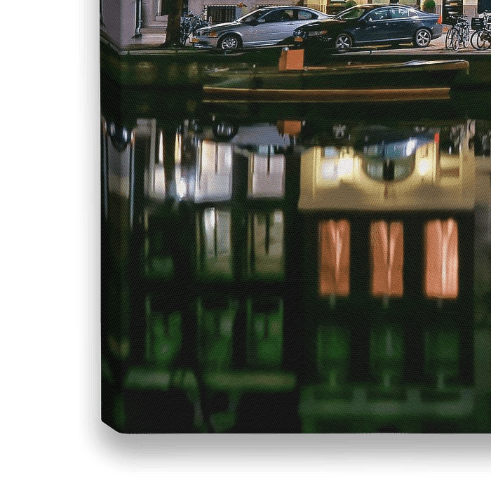 Kleurrijk verlichte ramen met reflecties in de gracht in nachtelijk Amsterdam