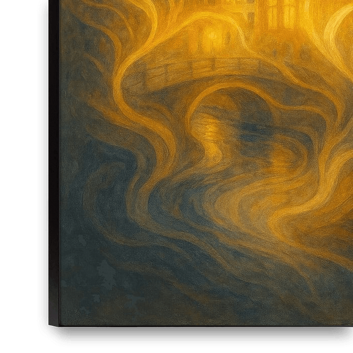 Een lichtgevend, poëtisch kunstwerk geïnspireerd op de gloeiende Amsterdamse grachtenpanden in de schemering. De warme amberkleurige tinten van het schilderij gaan over in zachte mist en creëren een intieme en nostalgische sfeer - ideaal voor kunstliefhebbers die houden van sfeer en emotie.