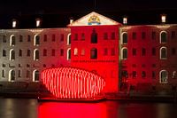 Scheepvaartmuseum Amsterdam (uit 1656, architect Daniël Stalpaert) tijdens het Amsterdam Light Festival. Het gebouw is rood verlicht door het lichtkunstwerk "Whale Fall" van Xinyi Wang, een karkas van een walvis.