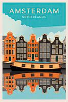 Kleurrijke huizen met puntgevels staan harmonieus langs de kust en hun weerspiegelingen dansen zachtjes op het water. De warme oranje en zwarte tinten geven het tafereel een uitnodigende sfeer. Een klein bootje glijdt rustig voorbij, terwijl de lucht glinstert in zachte blauwtinten. Een perfect beeld van het charmante leven in Amsterdam!