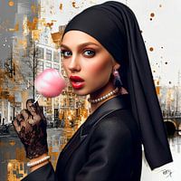 Dit digitale kunstwerk is een stijlvolle en eigentijdse herinterpretatie van Meisje met de parel. De mysterieuze vrouw, gekleed in elegant zwart met kanten handschoenen en parels, combineert klassieke schoonheid met moderne flair. De achtergrond van Amsterdamse grachten, in gouden tinten, voegt een nostalgisch en urban karakter toe. De…
