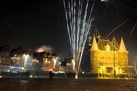 Vuurwerken schieten de lucht in bij Oud en nieuw op de Nieuwmarkt in Amsterdam