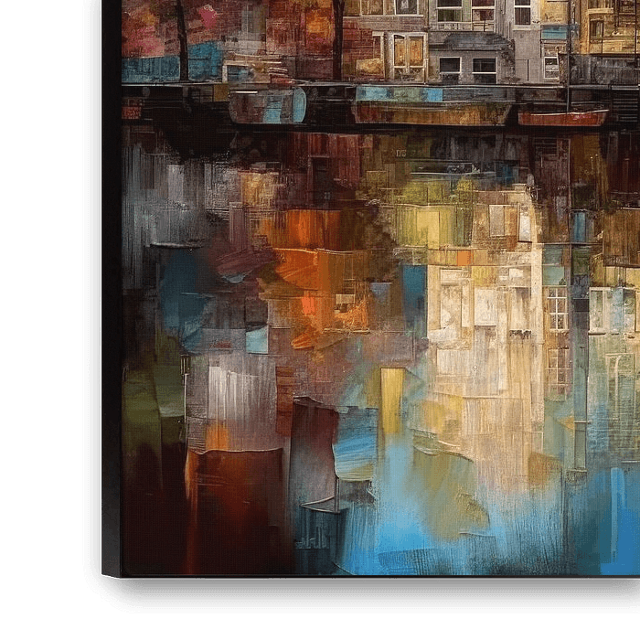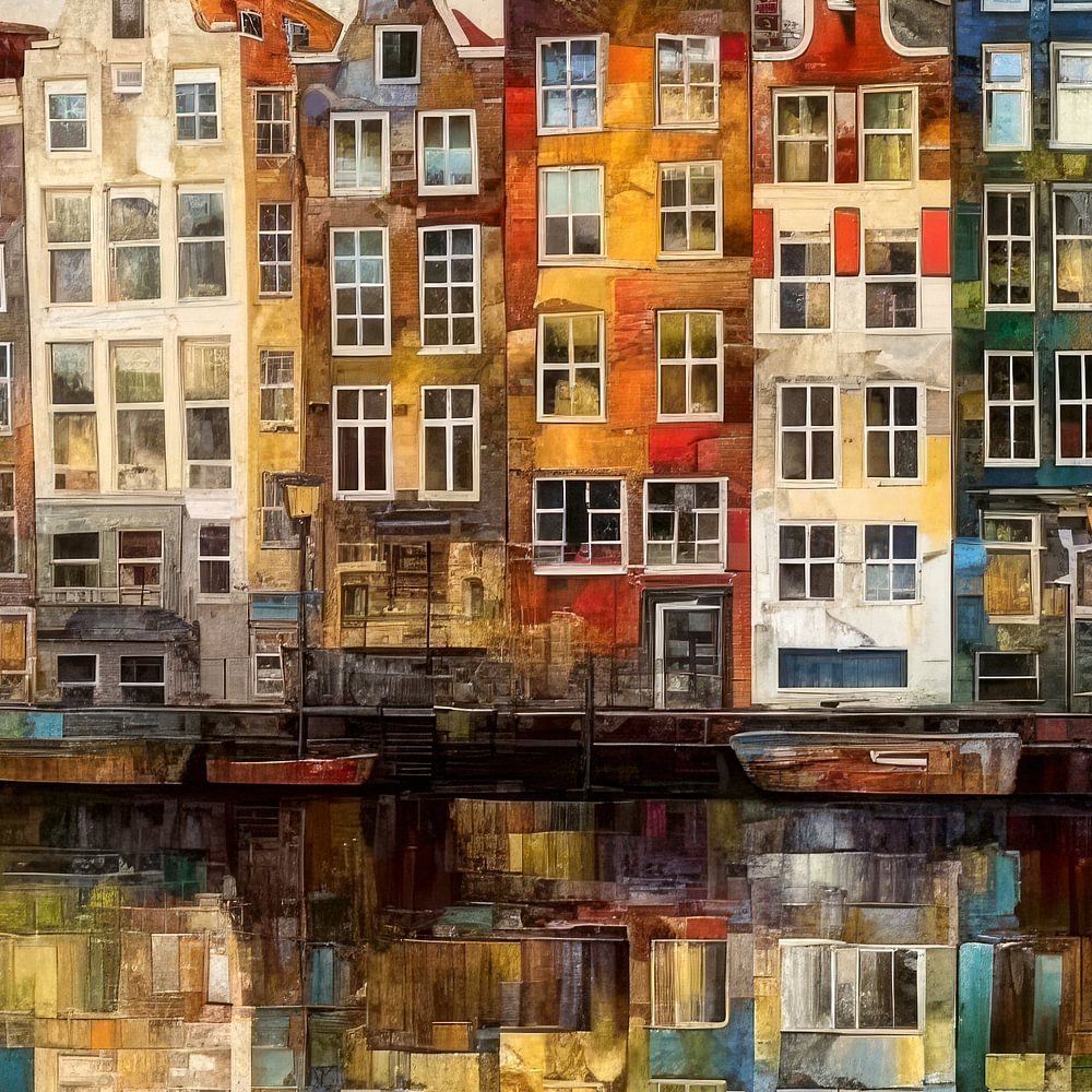 Dit kunstzinnige schilderij is geinspireerd op de charmante Amsterdamse gevels in al hun pracht en praal. Het straatbeeld van Amsterdam wordt gedomineerd door rijen van smalle, hoge gebouwen met verschillende kleuren en patronen op hun gevels. De grachten, die rustig door het hart van de stad stromen, weerspiegelen de gevels en voegen een gevoel van rust toe aan het bruisende stadsleven.