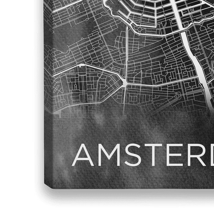 Dit is een zeer nauwkeurige stadskaart van Amsterdam met een moderne monochrome achtergrond dat geschilderd is met zwarte aquarel op aquarelpapier met de nat-op-nat techniek. Onder het kunstwerk staat de stadsnaam. Omdat het aquarel vrij abstract is aangebracht zie je in dit werk een vlakverdeling dat bestaat uit zowel donkere als lichte delen. De lichtere plekken doen denken aan lichte wolken, dat de indruk wekt alsof je Amsterdam vanuit een vliegtuig bekijkt. Dit kunstwerk is een samensmelting van analoge en digitale illustraties.