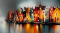 Dit schilderij toont een abstracte weergave van de grachtenhuizen van oud Amsterdam, verlicht door warme, zachte tinten die reflecteren op het water van de gracht. De huizen zijn geschilderd in levendige kleuren zoals rood, geel, oranje en blauw, en hun vormen vloeien op dromerige wijze in elkaar over, alsof ze in mist gehuld zijn. De…
