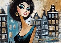 Amsterdam | Vrouw Oorbel - In dit vrouwen schilderij zie je een vrouw met een opvallende oorbel, die met een zelfverzekerde blik tegen een achtergrond van typisch Nederlandse huizen staat, geschilderd in een moderne stijl met aardetinten en felle kleuren.