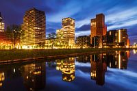 Prachtige opname van de kantoorgebouwen aan de Amsterdamse Zuid-as tijdens het blauwe uur vroeg in de ochtend met een mooie reflectie in het water