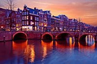 Amsterdam aan de Brouwersgracht in Nederland bij zonsondergang
