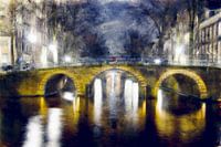 Een expressionistisch schilderij van Amsterdam bij nacht. Dit zeer gedetailleerde kunstwerk is een kunstige fusie van analoge en digitale illustraties in de stijl van de klassieke kunst.