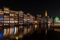 Amsterdam centrum bij nacht. De toren van de Oude Kerk is verlicht in de achtergrond.
